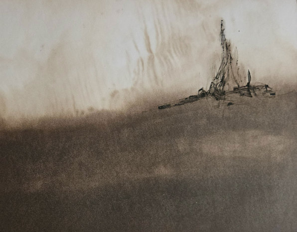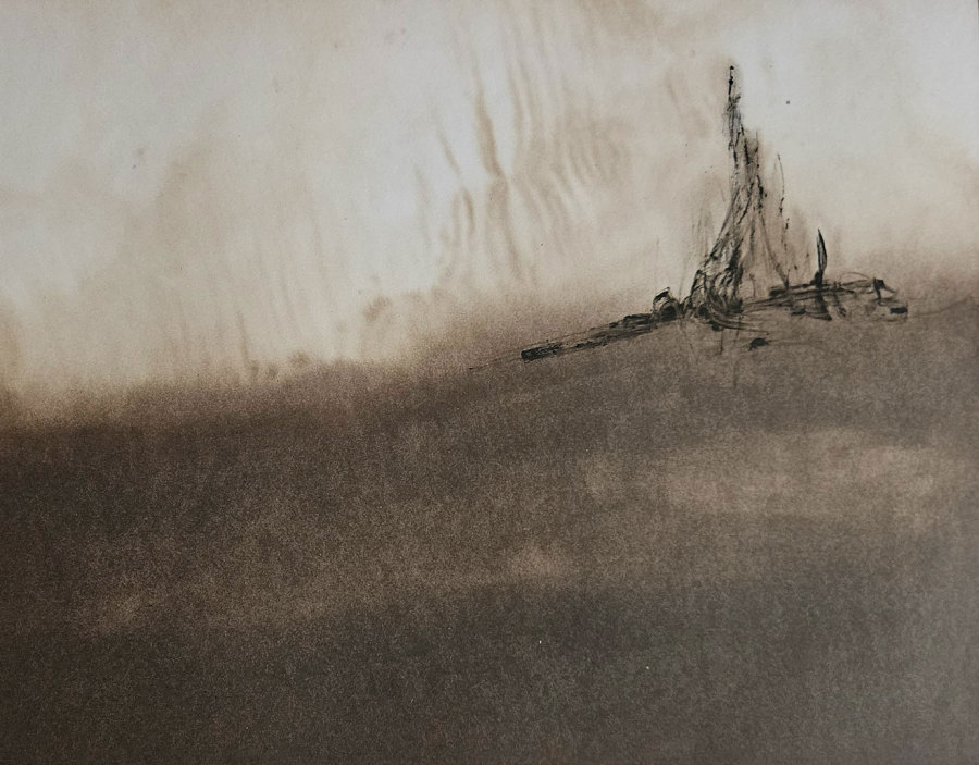 dans la suite de « Terres povera » et « La vague ». Le grain de la matière a disparu et désormais l’utilisation de goudron dilué à l’extrême fait naître des paysages énigmatiques semblant déserts